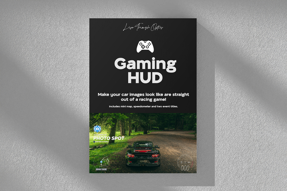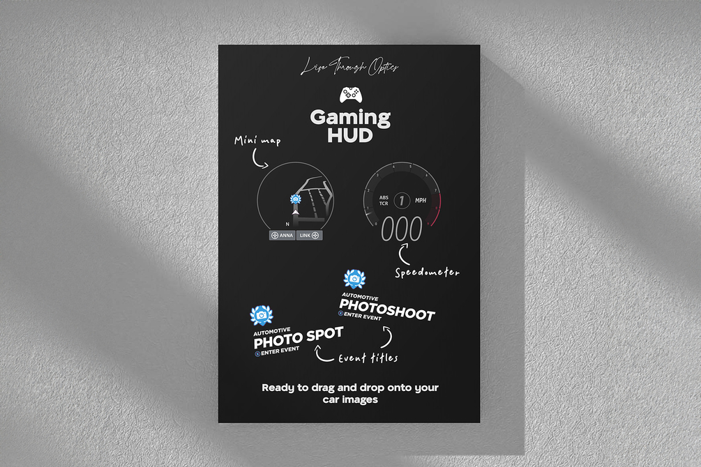 Apply this gaming HUD graphics pack straight onto your car images to quickly and easily add a bit of creative flare!
